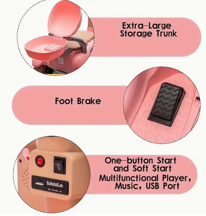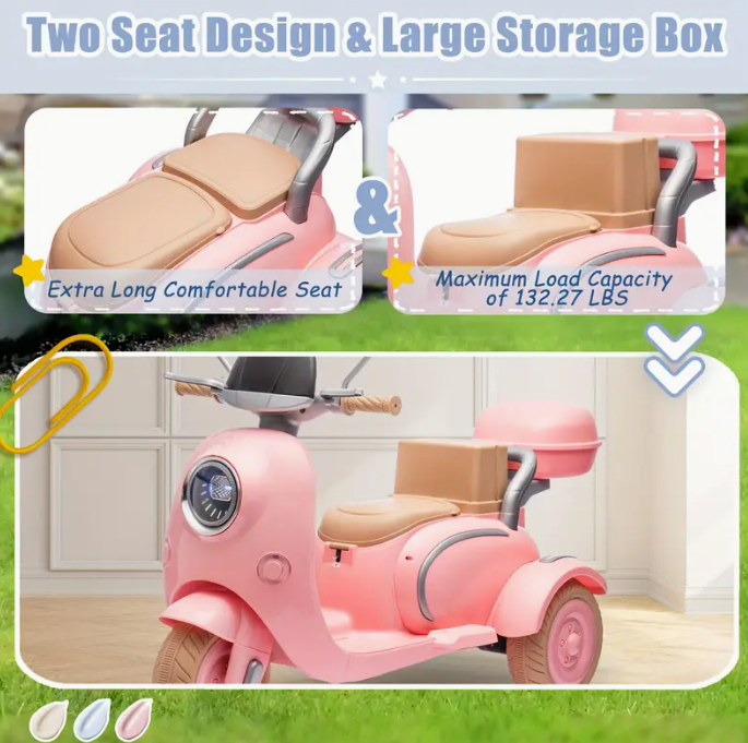 12V two-seater children's electric toy motorcycle, three-wheeled children's toys, slow start, multi-function player, USB, lights, adult clamshell back seat, children 3-6 years old, large storage box f