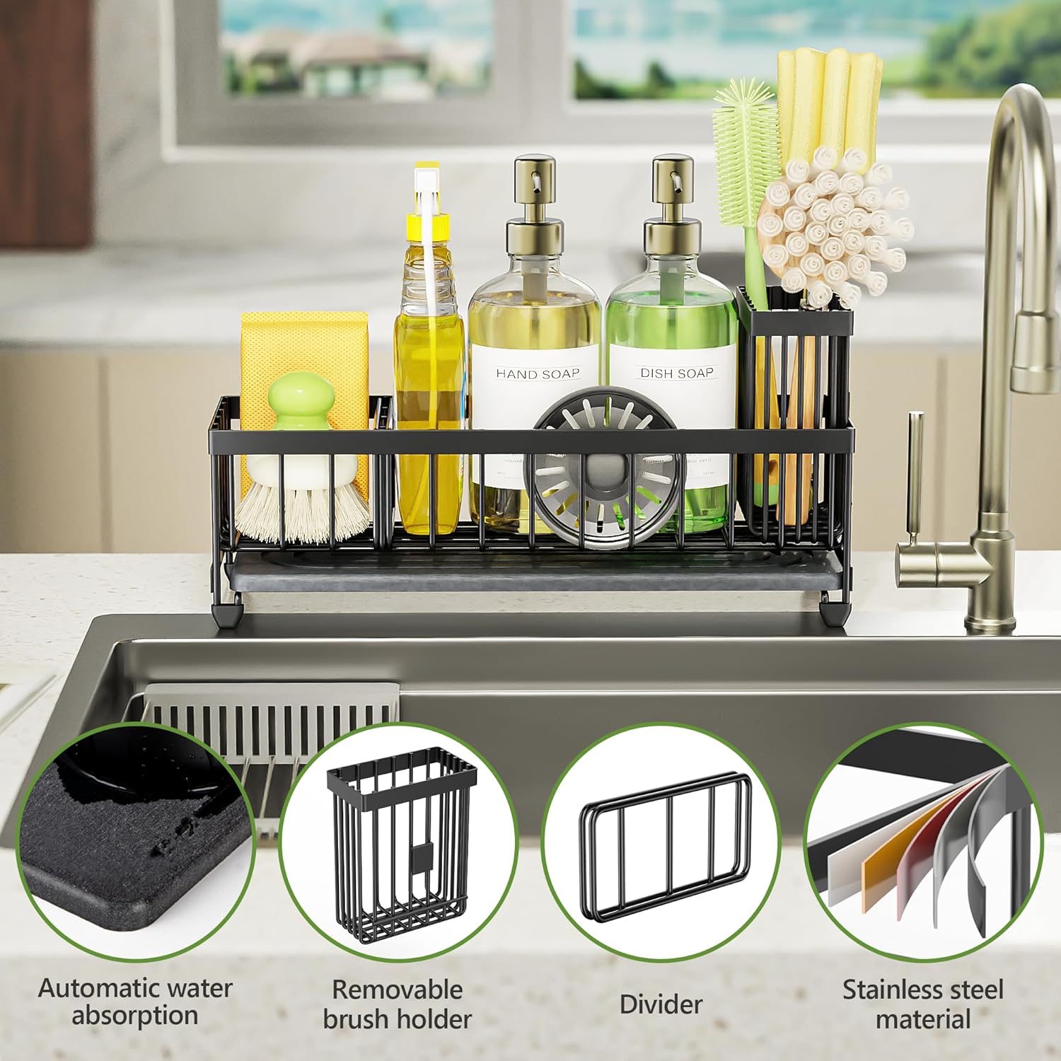 Cisily Large Sink Caddy Organizer with Drying Stone, Black Sponge Holder for Kitchen, Sink Brush Holder for Countertop, Home Decor Storage and Organization