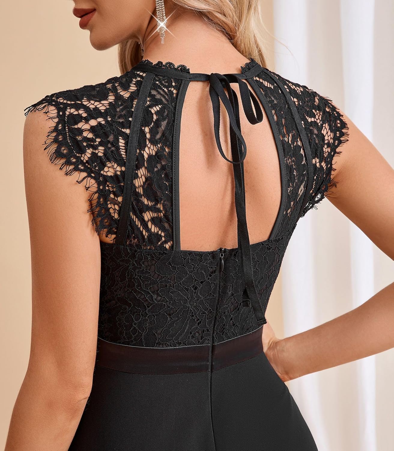 Cololura Women Elegant Sexy Sleeveless Lace Floral Patchwork Ruffle Hem Formal Party A-Line Cocktail Midi Dress