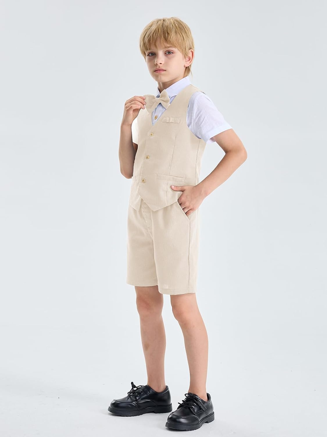 LOLANTA Boys Linen Suit 4 Piece Summer Gentleman Outfit Kids Dress Vest Shirt Shorts Set for Beach Wedding Graduation