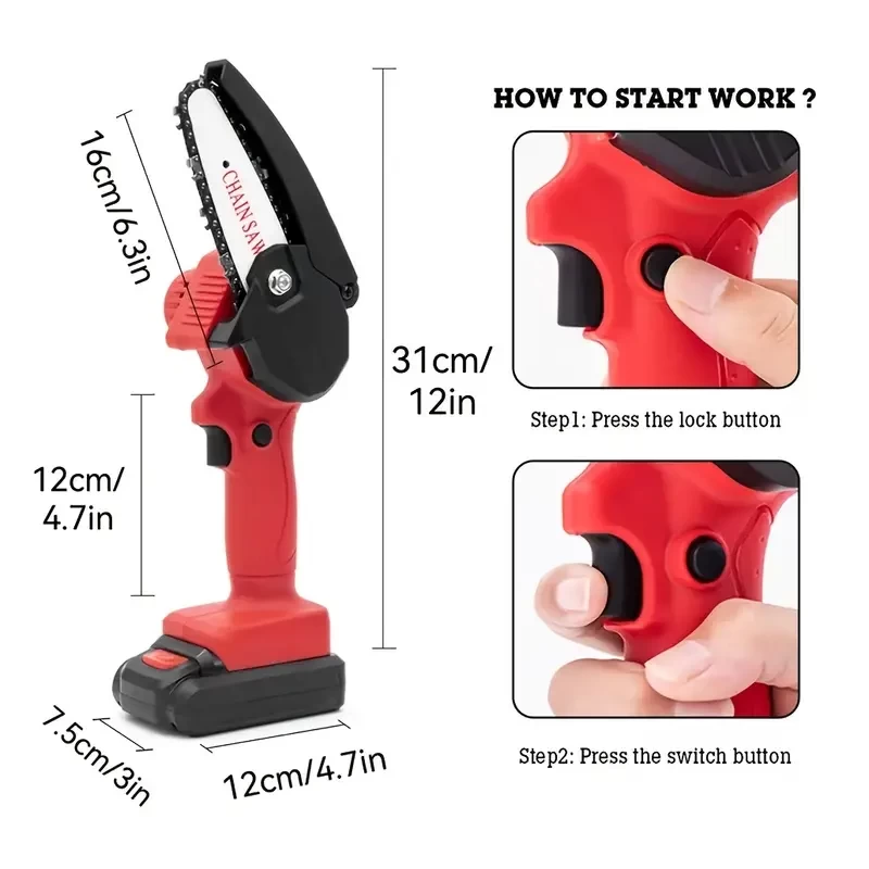 Mini 4inch Chainsaw Cordless, Handheld Mini Chain Saw For Wood Cutting Tree Trimming, Battery Powered Electric Chainsaw, With 2 Batteries, Black/Red