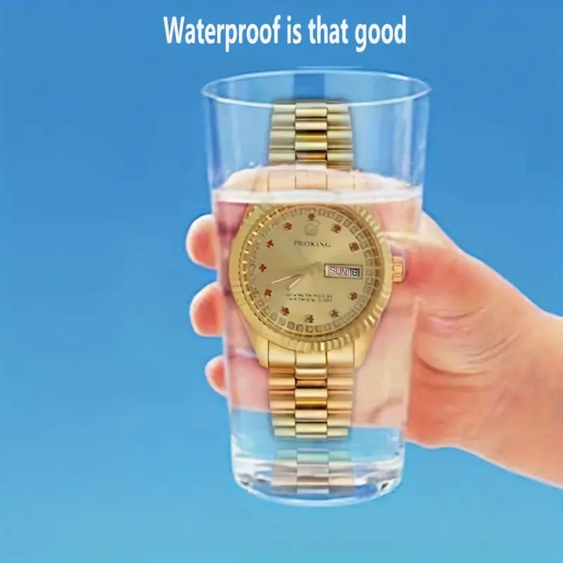 PROKING Men's Golden Waterproof Dual Calendar Solid Core Steel Band Business Wristwatch