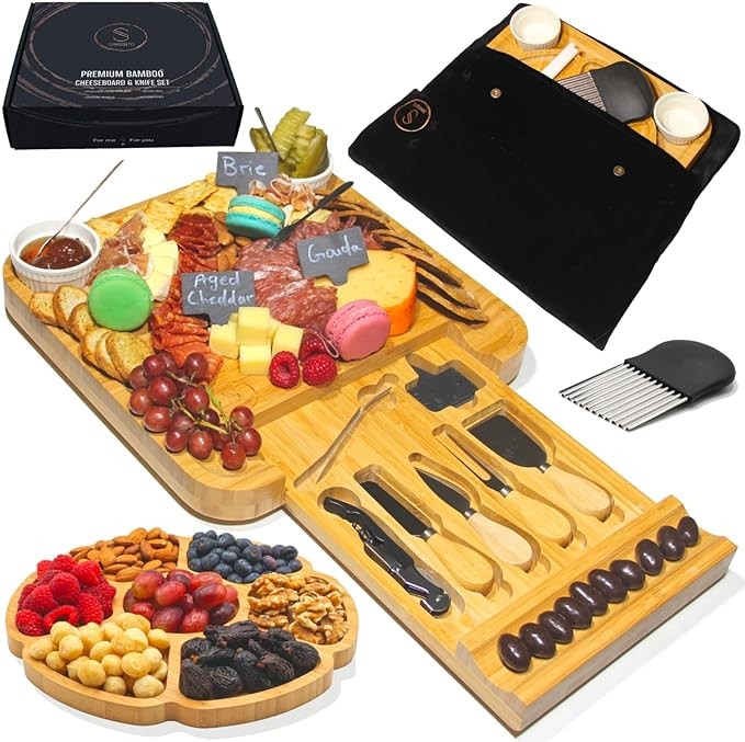 SIMOSITO Large Deli Board with Gift Box and Velvet Bag - Cheese Board with knife set, tray and fold cutter - Valentine's Day gift for Mom, lady's birthday gift, new home gift