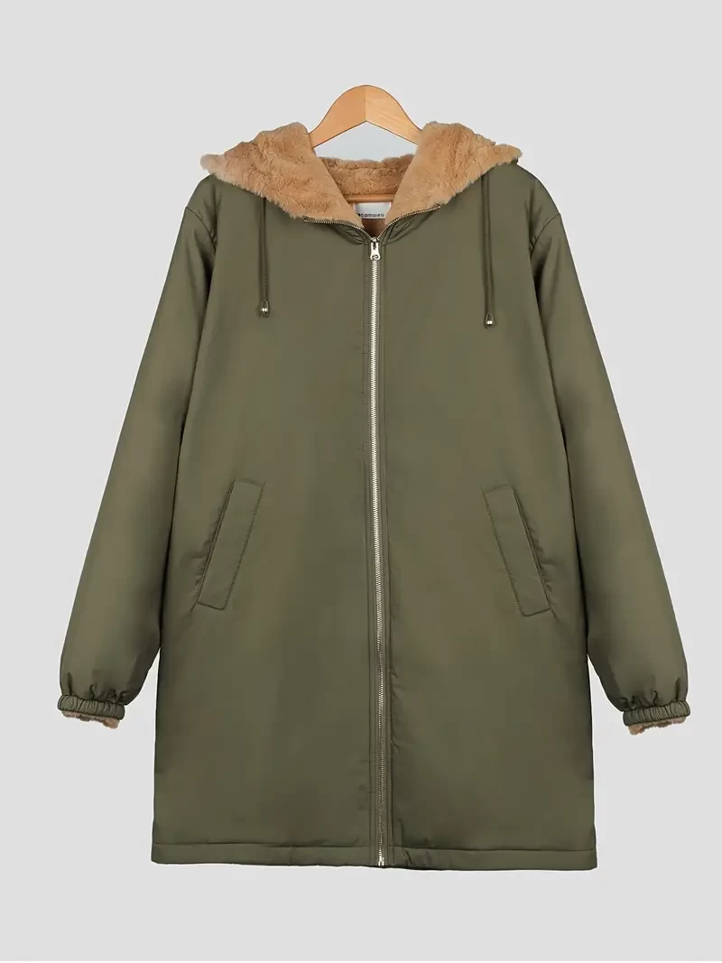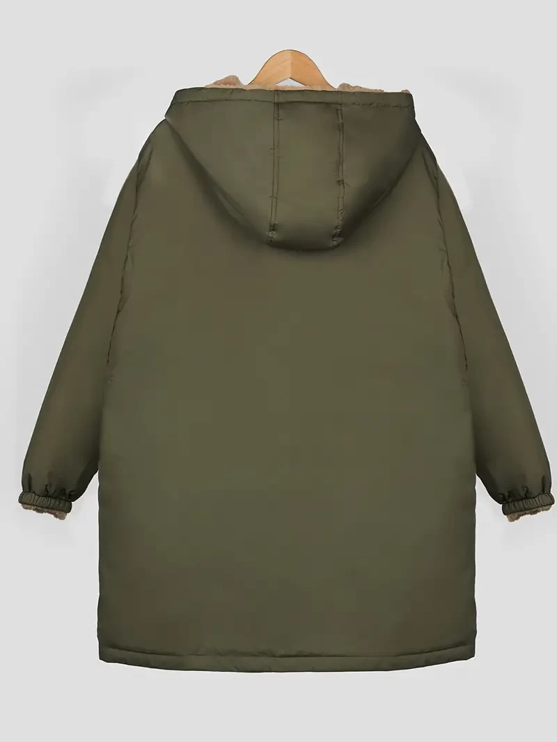 Solid Hooded Full Zipper Coat, Warm Mid-length Pocket Coat, Outerwear For Fall & Winter, Women's Clothing