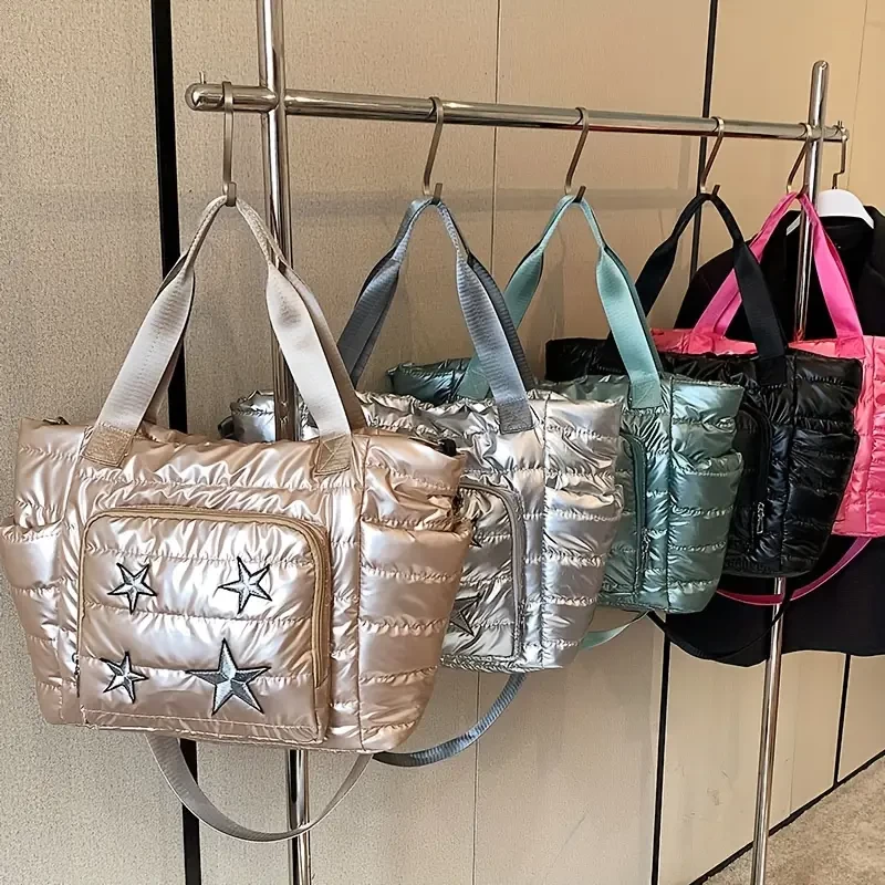 Star Embroidery Padded Tote Bag, Puffer Quilted Crossbody Bag, Lightweight Autumn Winter Shoulder Bag