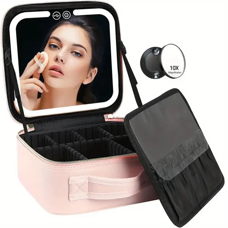 Travel Makeup Bag With LED Lighted Make Up Case With Mirror 3 Color Setting Cosmetic Makeup Box Organizer Vanity Case For Women Beauty Tools Accessories Case Rechargeable