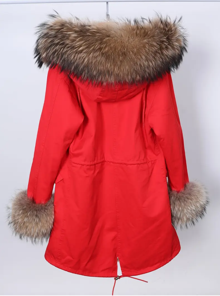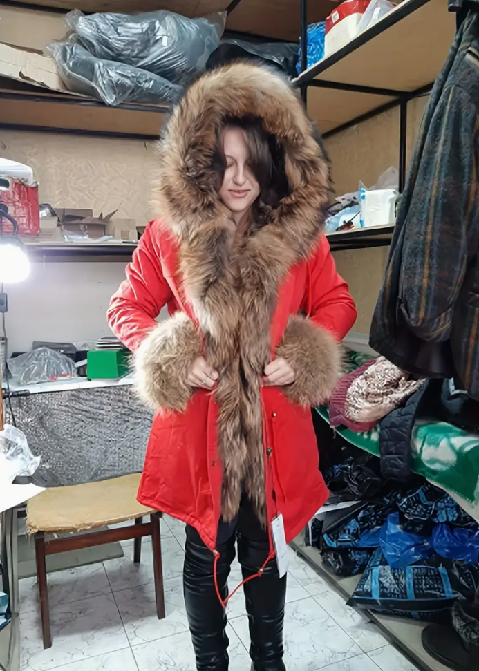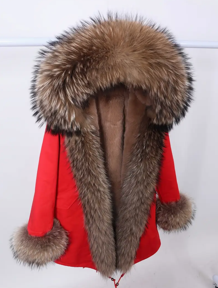 1 elegant winter coat for women, thickened mid-length puffy coat, imitation fur hat, polyester, X-tail, long sleeves, regular cut, solid color, zipper closed, non-stretch, waterproof, lightweight