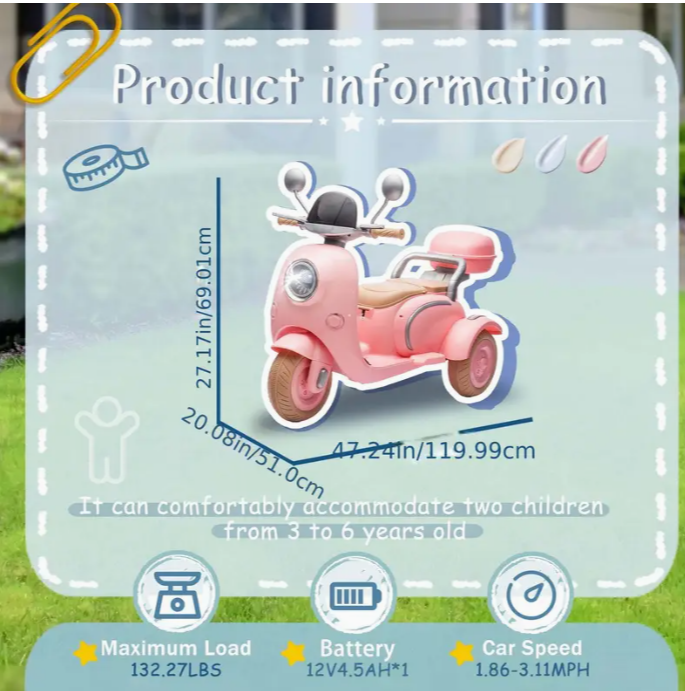 12V two-seater children's electric toy motorcycle, three-wheeled children's toys, slow start, multi-function player, USB, lights, adult clamshell back seat, children 3-6 years old, large storage box f