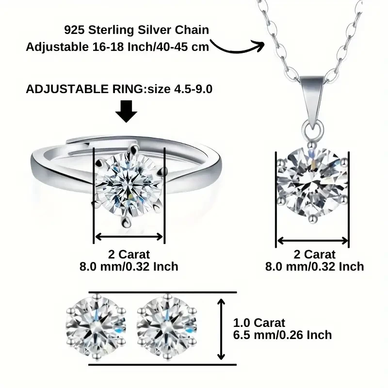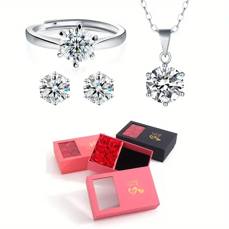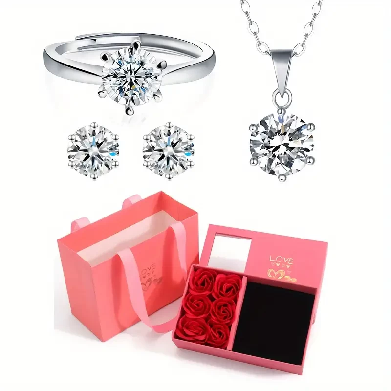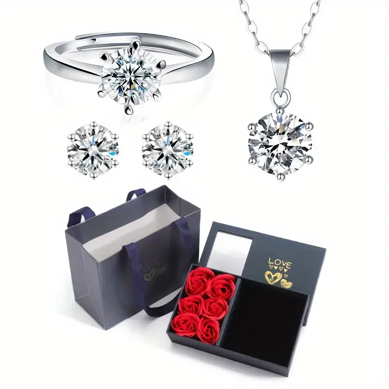 1sets 6-Prong Moissanite Adjustable Ring + Pendant Necklace + Stud Earrings Jewelry Set, With Rose Flower Gift Box For Girls Christmas Confession Gift