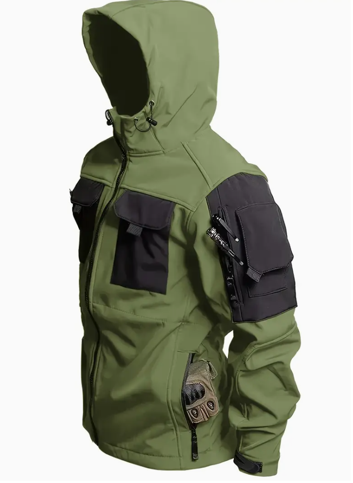 A hardy and warm outdoor outfit, consisting of two pieces, comes with a waterproof jacket with multiple pockets and a hat, wide pockets for mass storage, and a design for retaining heat. This stylish