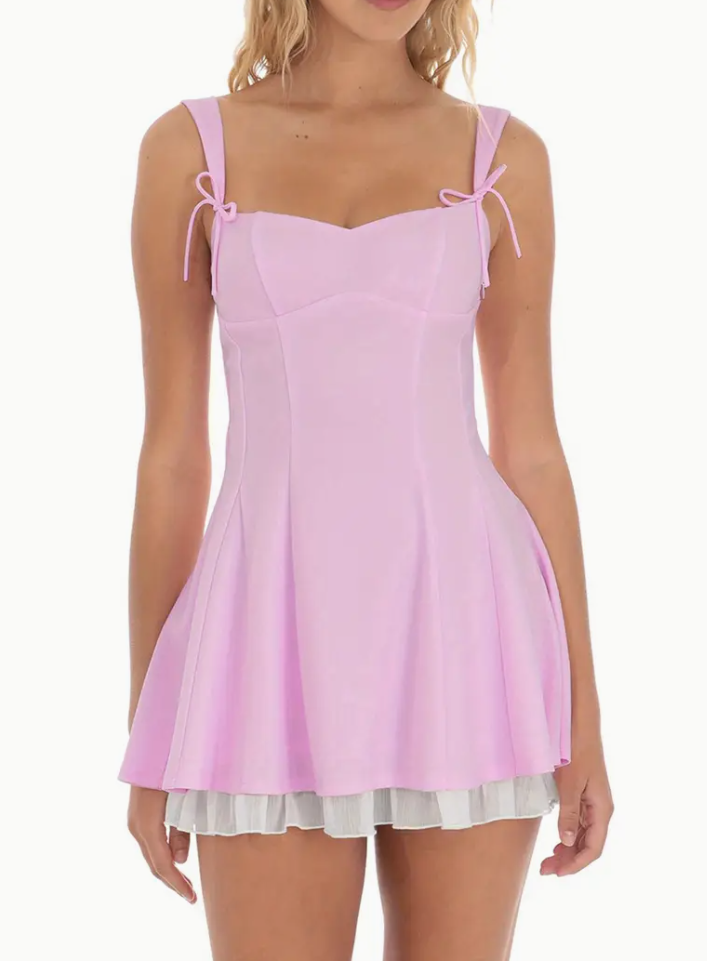 A women's summer sexy square neck solid color slip dress with contrasting lace and bow halter details, off-the-shoulder nonwoven dress for adults