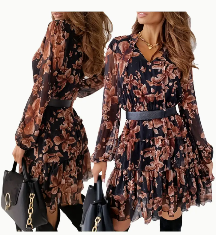 An elegant floral V-neck long-sleeved dress with high-waisted ruffles and A lace-up belt, polyester woven A-line skirt with applique details for a stylish swing style for all seasons