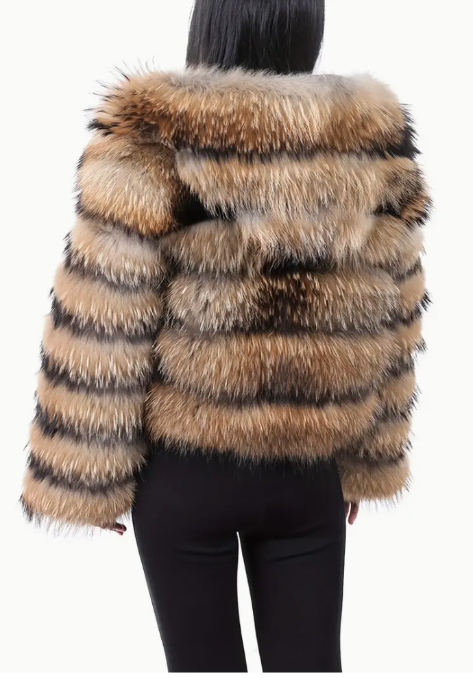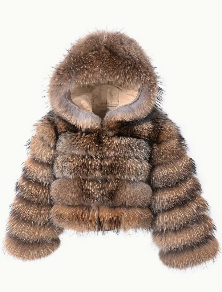 An elegant lady's fur imitation hooded coat - polyester knit fabric, solid color, long sleeves, non-elastic, winter chic, feathered detail, single button opening, slit hem - perfect for going out