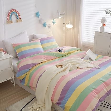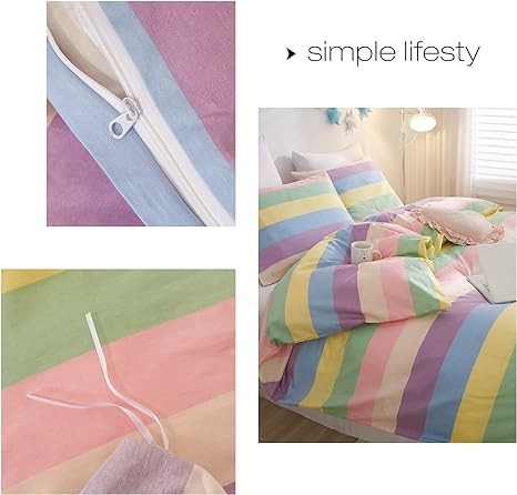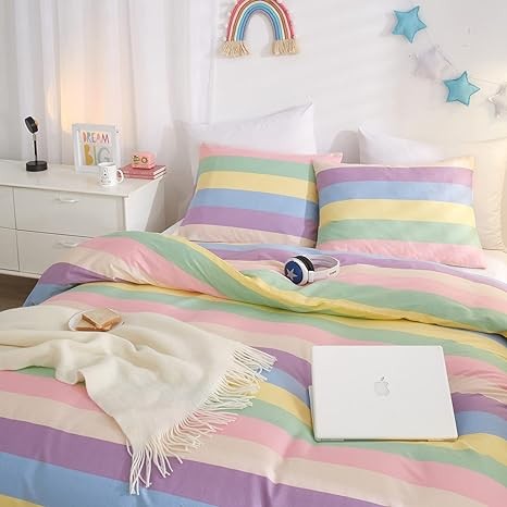 AOJIM Cartoon Duvet Cover Rainbow Pure Cotton Cute Bedding Set 3pcs Colorful Stripes Comforter Cover Queen Size for Girls Women (no Comforter)