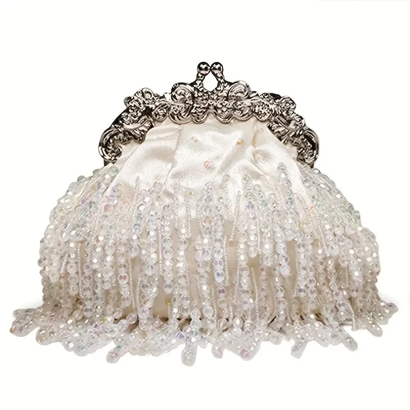 Beaded Crystal Evening Bag For Women, Tassel Decor Kiss Lock Clutch Purse, Elegant Satin Handbags For Wedding Prom Party