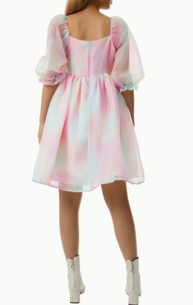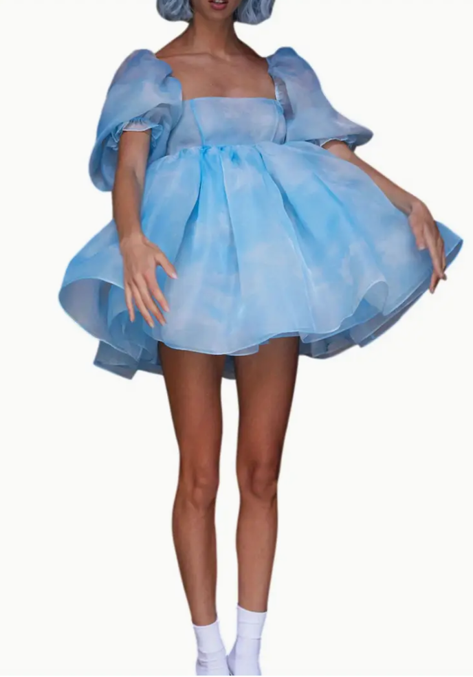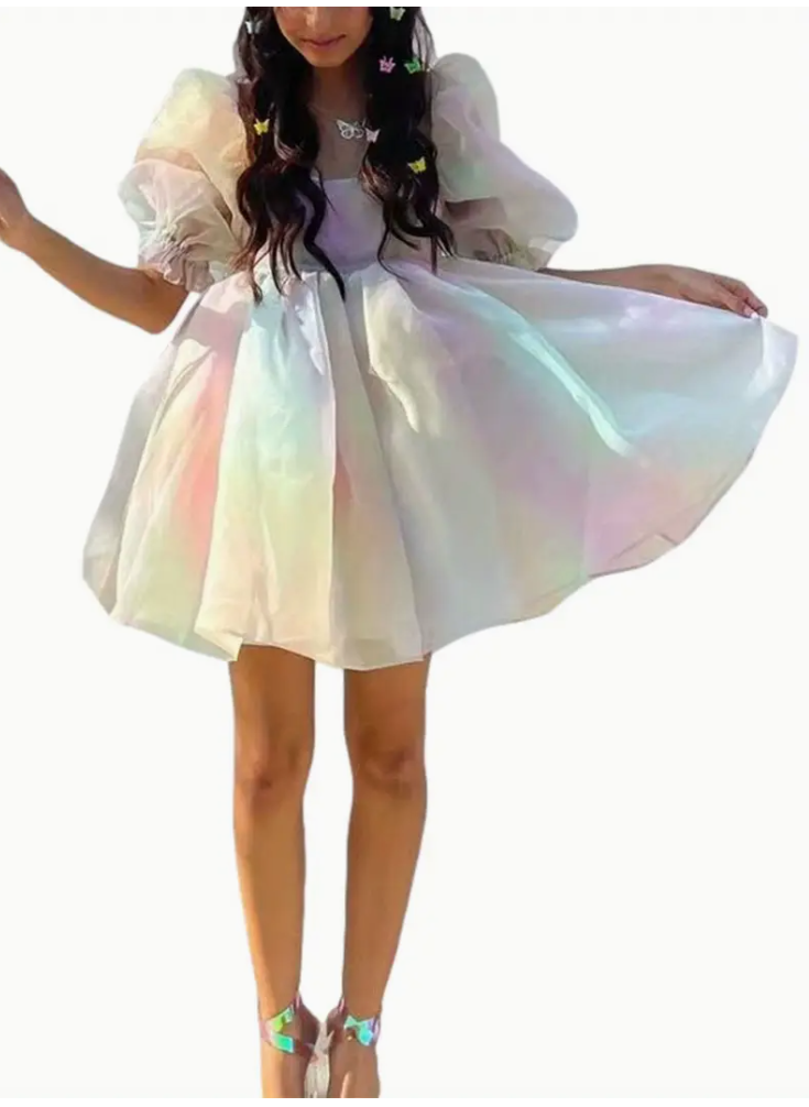 Elegant turtleneck solid color sweater dress for women, spring and autumn knitted fabric, with fake lace-up details, short puffy sleeves and large train, suitable for adult party wear.