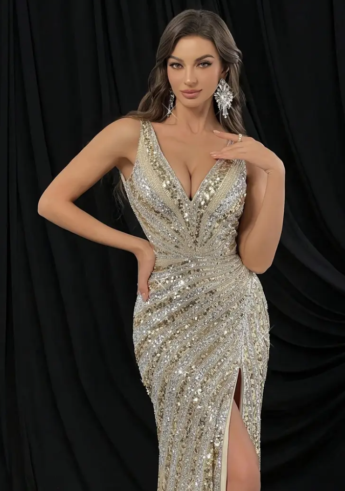 Elegant V-neck jeweled Merman dress, sleeveless polyester evening dress, 100% polyester, all seasons, slim-fit design, floor length, with geometric pattern, no belt, suitable for adult formal dinner