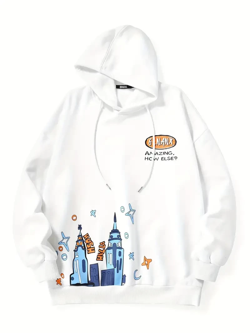 GENANX Men's Fashion Castle Print Hoodie, Casual Slightly Stretch Breathable Hooded Sweatshirt For Outdoor