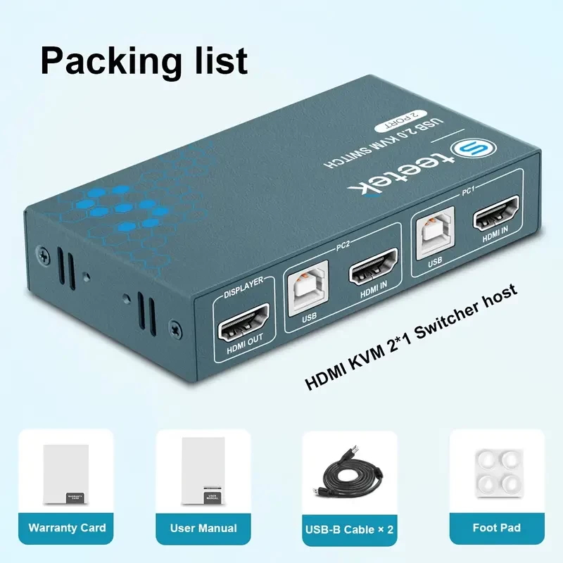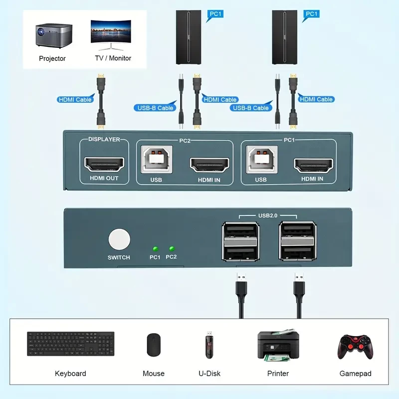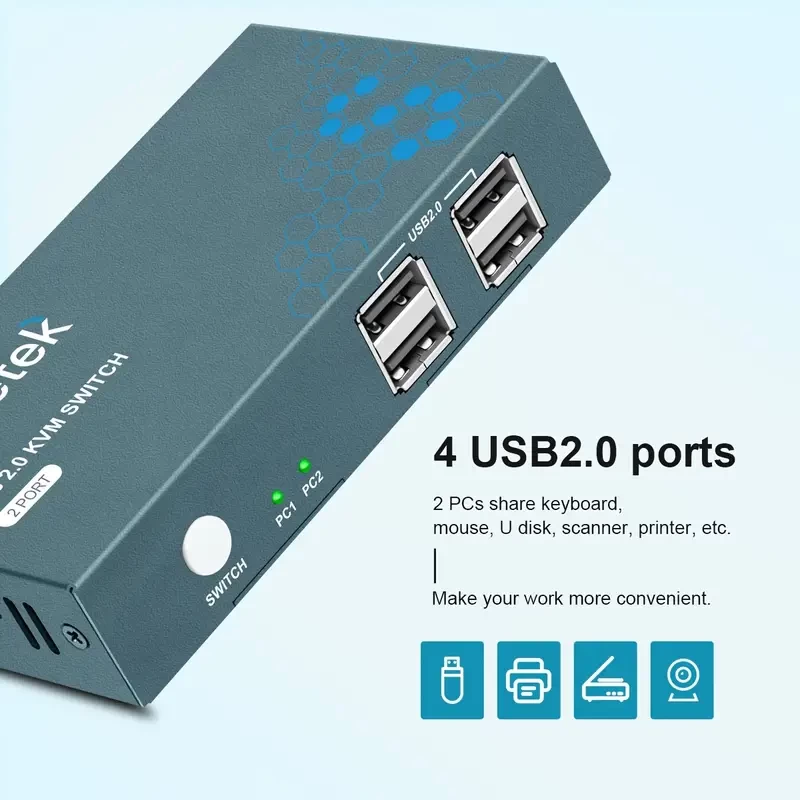 HDTV KVM Switch 1 Monitor 2 Computers With 4 USB 2.0 Ports, Supports UHD 4K@30Hz, KVM Switch 2 Port Pushbutton Switches, 2 USB Cables Included