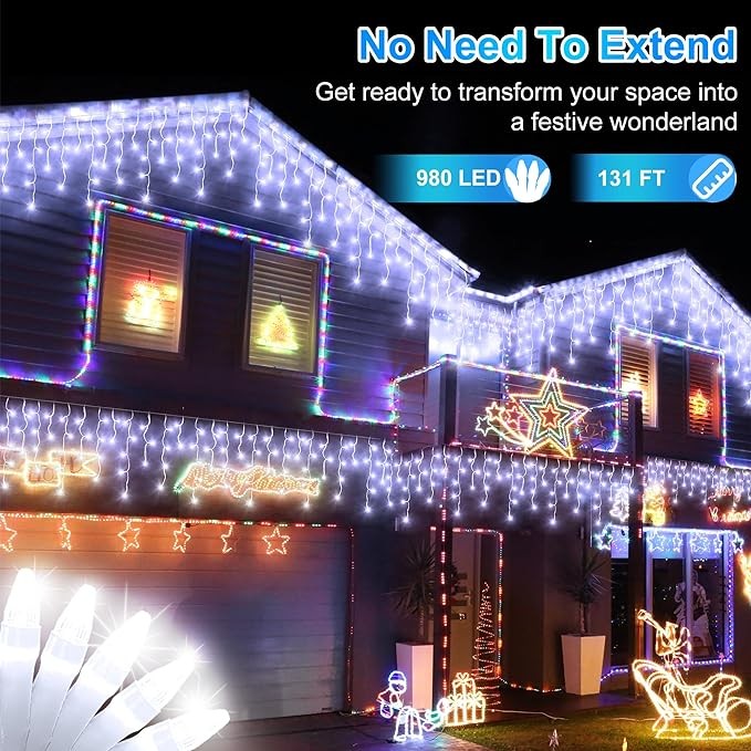 HRANBOTY 132 FT LED Christmas Lights with 280 Drops, 980 LED Indoor Outdoor Christmas Decorations, 8 Lighting Mode Waterproof Fairy Lights with Timer for Xmas Holiday Wedding Yard Party Cool White