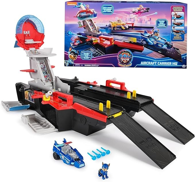 Introducing PAW Patrol aircraft Carrier Headquarters! This shape-shifting aircraft carrier toy is perfect for exciting rescue missions at fake sea and comes with the real PAW Patrol:Mighty Movie Chase action figures and Chase's authentic police car rescue vehicle! The aircraft carrier headquarters measures 26 inches (66.0 cm) by 14 inches (35.5 cm) and can convert up to 37 inches (93.0 cm) by 17 inches (43.2 cm) when in rescue mode. Push down the command center of the headquarters, automatically triggering an awesome transformation by lifting up the control room and splitting the deck into 2 separate vehicle launch ramps, revealing the meteor core, lighting up and activating sound when you push it, and then opening four compartment doors for additional play areas and storage for toy cars, accessories and action figures! When it's time for a super rescue mission, load your rescue vehicle onto the launch ramp and then press the start button to watch your vehicle explode! The Aircraft Carrier HQ also comes with 2 catapult launchers that you can load and launch to clear obstacles during the rescue! With PAW Patrol toys, a child can explore his or her imagination and develop their motor skills through pretend play while reliving their favorite scenes! For more fun and exciting PAW Patrol Team inspiration missions, collect all PAW Patrol movie toys, such as the awesome Plane Transport Ship Headquarters and all special edition PAW patrol toys, such as Mighty Pups, Aqua Pups and Paw Patrol Big Truck Pups toy figures and toy sets (each sold separately) enjoy endless PAWsome adventures with your favorite hero puppies at the Aircraft Transport Ship headquarters.