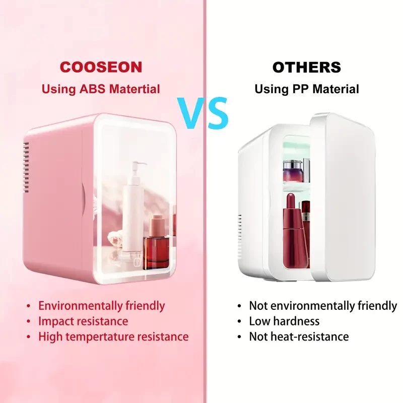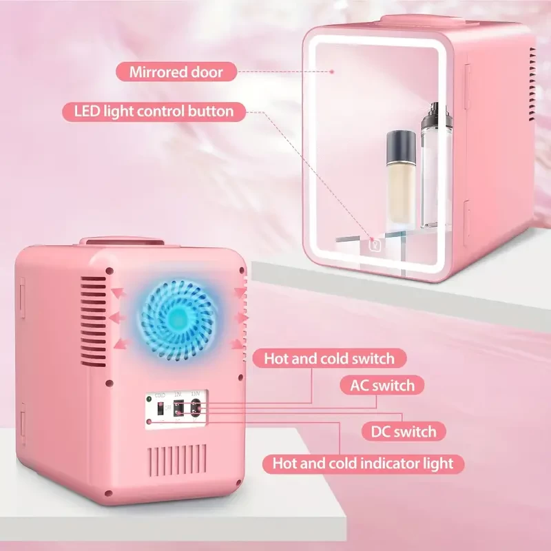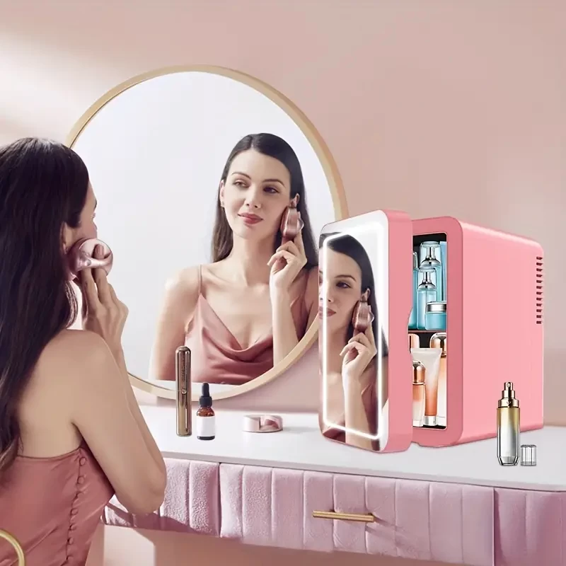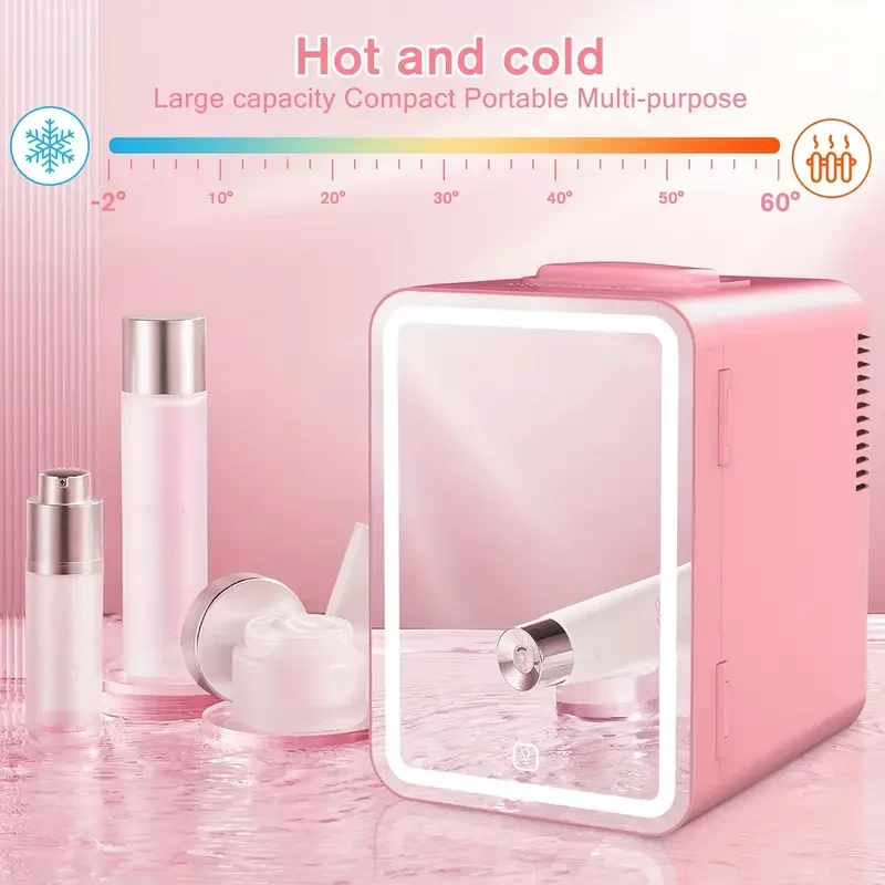 Portable LED Mini Refrigerator For Skin Care Products, Masks, And Cosmetics - Hot And Cold Storage, 1.59gal Capacity, Mirror Beauty Makeup Design