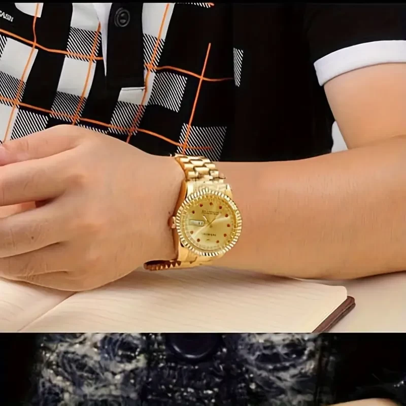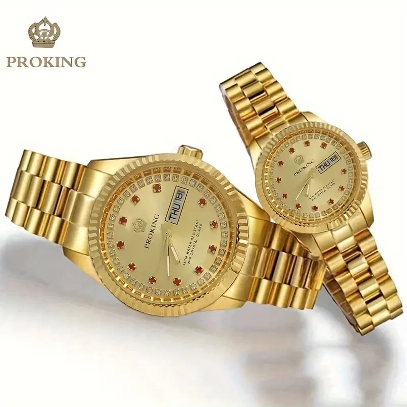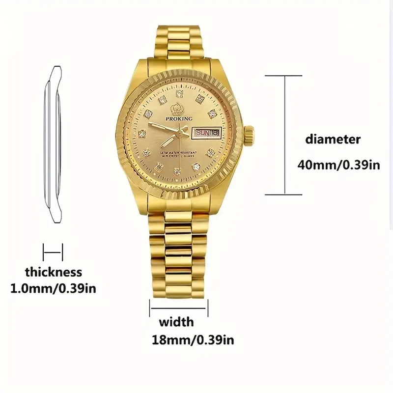 PROKING Men's Golden Waterproof Dual Calendar Solid Core Steel Band Business Wristwatch