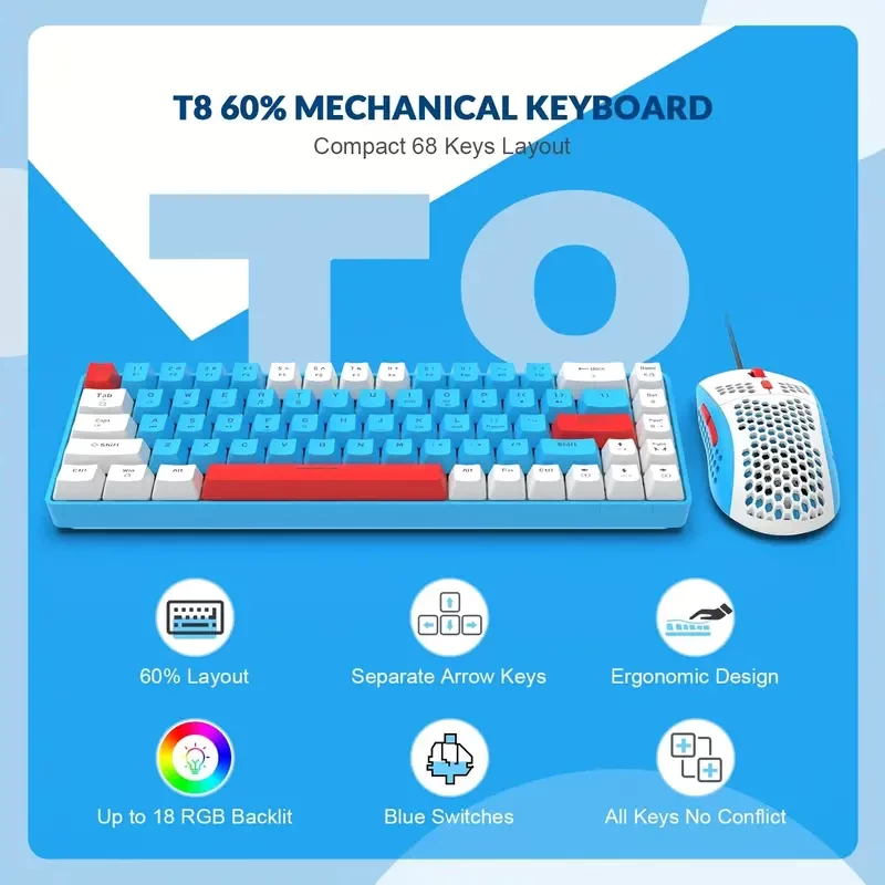 RK-T8PR0 Wired 65% Mechanical Gaming Keyboard And Mouse Combo With RGB Backlit Anti-ghosting TKL Mini 68 Key Coiled C To A Cable Tactile Blue Switch For PS4 PS5 Xbox PC Mac Gamer