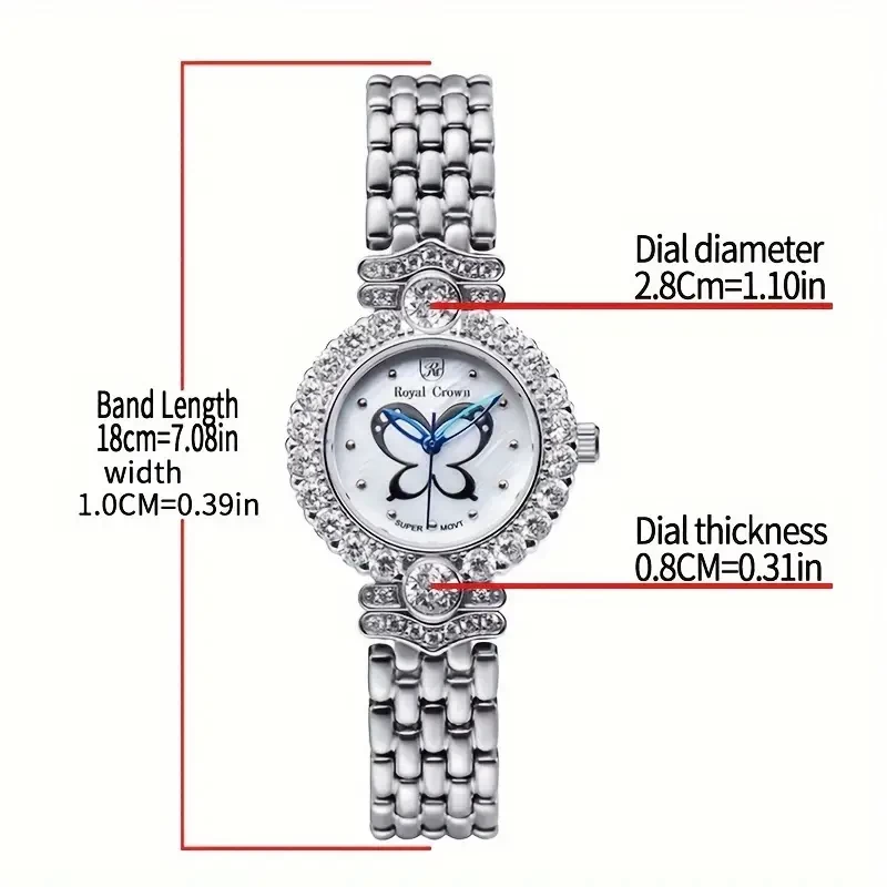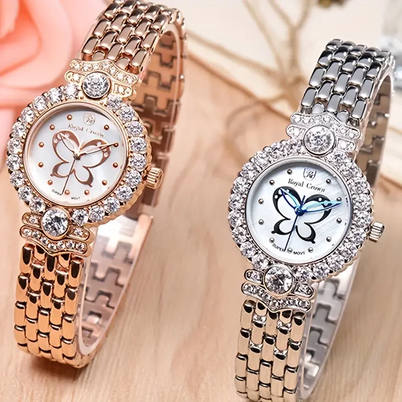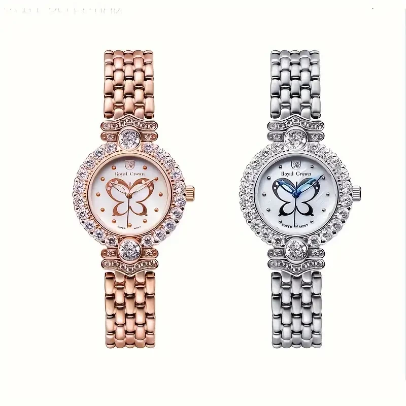 ROYALCROWN Fashion Butterfly Series Steel Band Waterproof Rhinestone Quartz Wrist Watch, Ideal Choice For Gifts