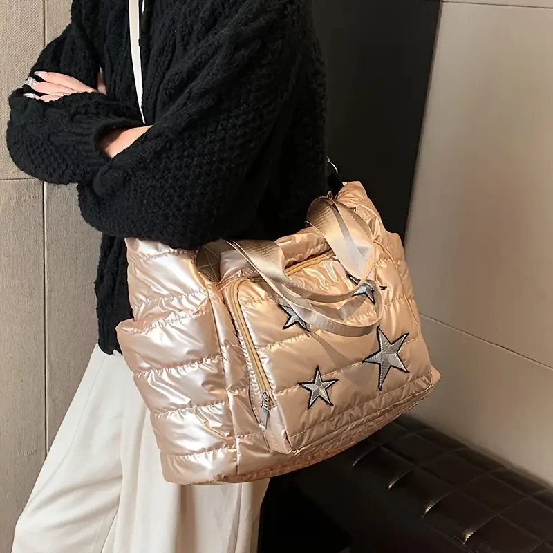 Star Embroidery Padded Tote Bag, Puffer Quilted Crossbody Bag, Lightweight Autumn Winter Shoulder Bag