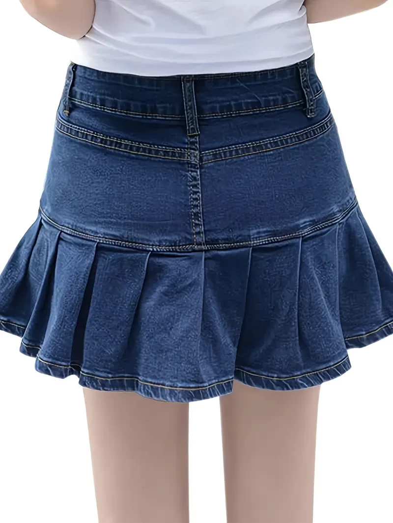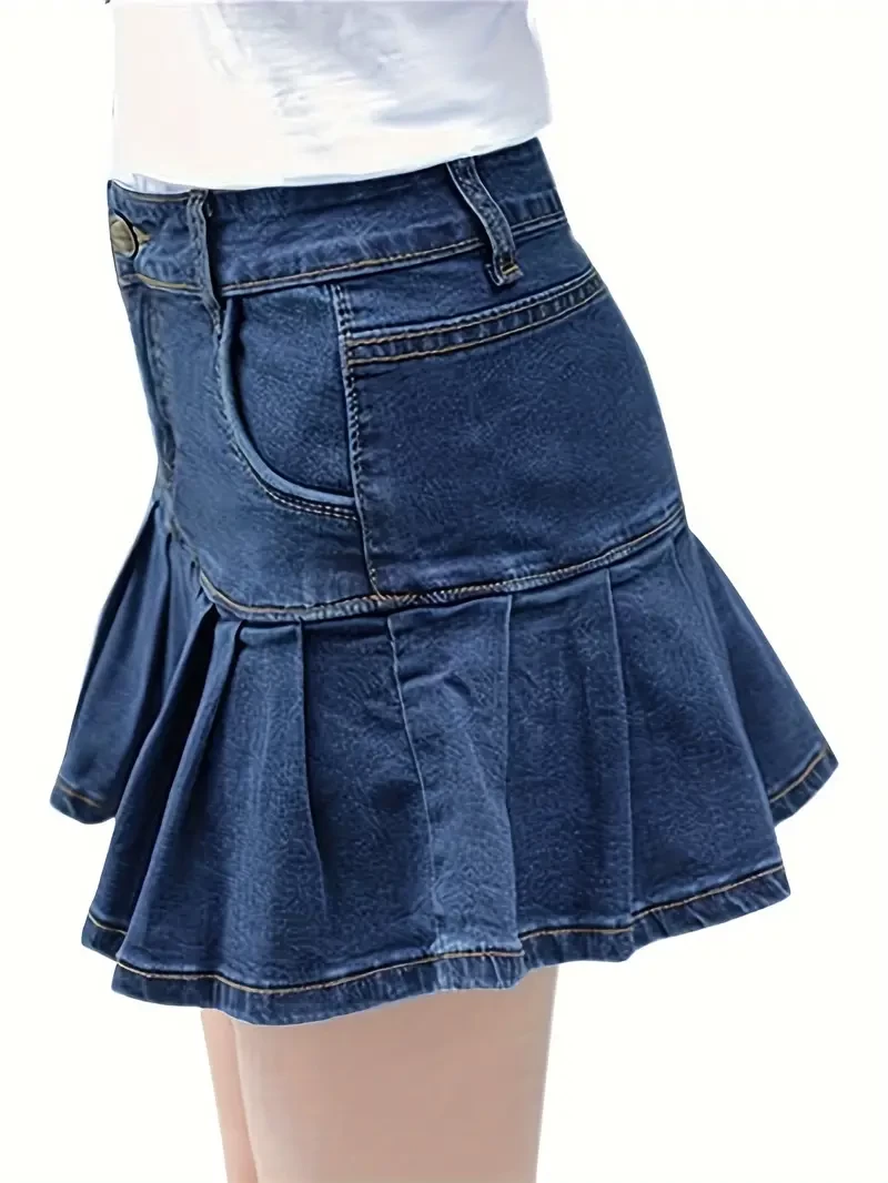 Stylish ladies casual A-line short denim skirt with pleats and ruffles Y2K style