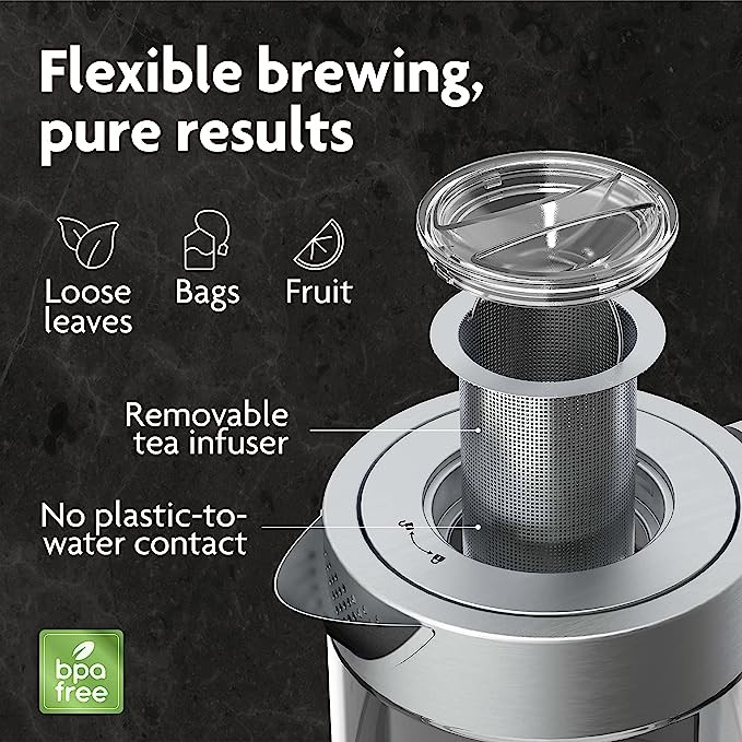 Vianté Hot Tea Maker Electric Glass Kettle with tea infuser and temperature control. Automatic Shut off. Brewing Programs for your favorite teas and Coffee. 1.5 Liters capacity.