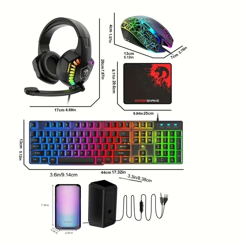 Wired Gaming Keyboard And Mouse And Mouse Pad And Gaming Headset And Speaker 5 In 1 Combo ,Rainbow LED Backlit Keyboard,Headphone With Mic,Gaming Mice,Mouse Pad,for PC Gamers And Xbox And PS4