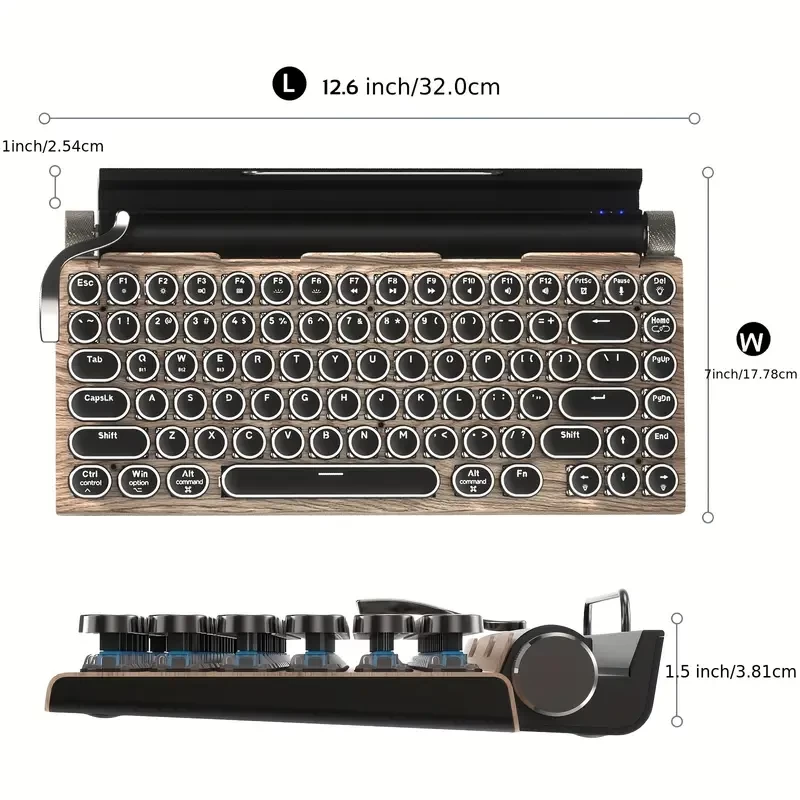 Wired & Wireless Retro Multi-Device Mechanical Typewriter, Compact 80% Layout Keyboard, Hotswappable, Bluetooth 5.0, Round Keycaps, LED Backlit, For Windows/macOS/Android/Linux, Blue Switch