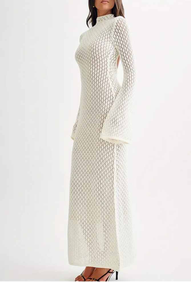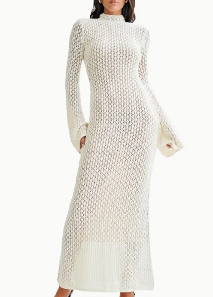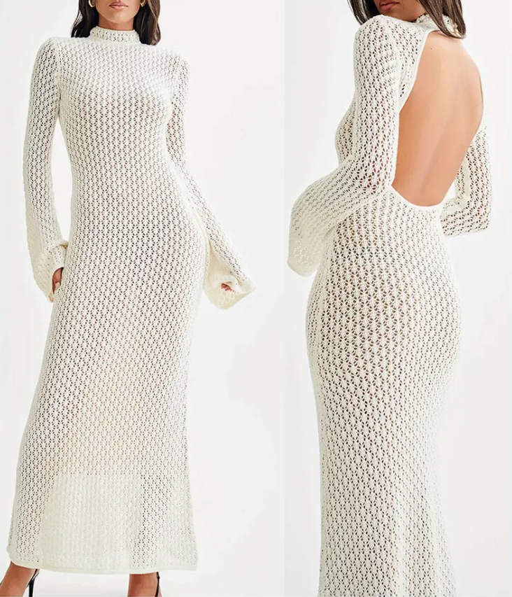 Women's long-sleeved cut-out dress - 100% viscose round neck solid color puffy skirt, suitable for spring, summer and fall, casual beach vacation and street style