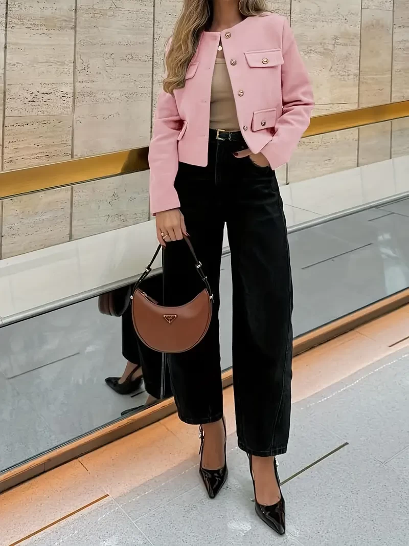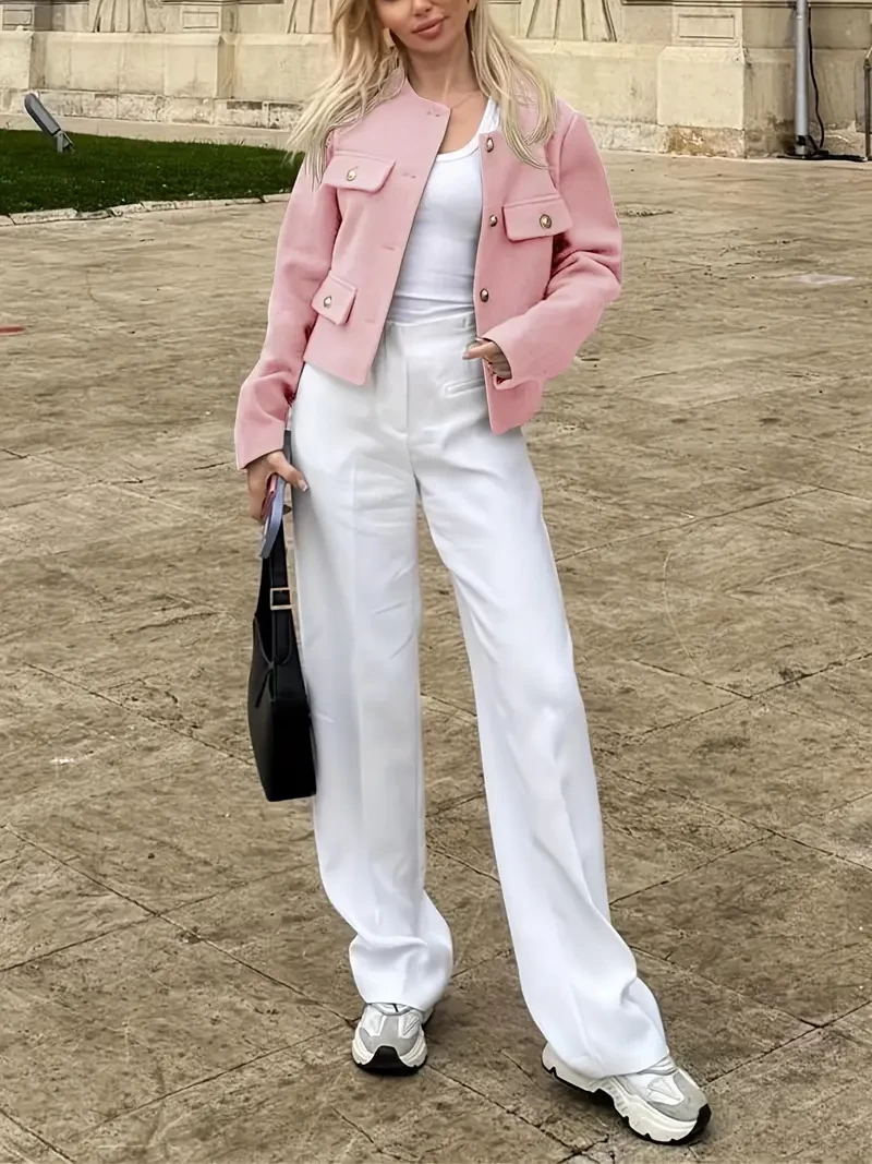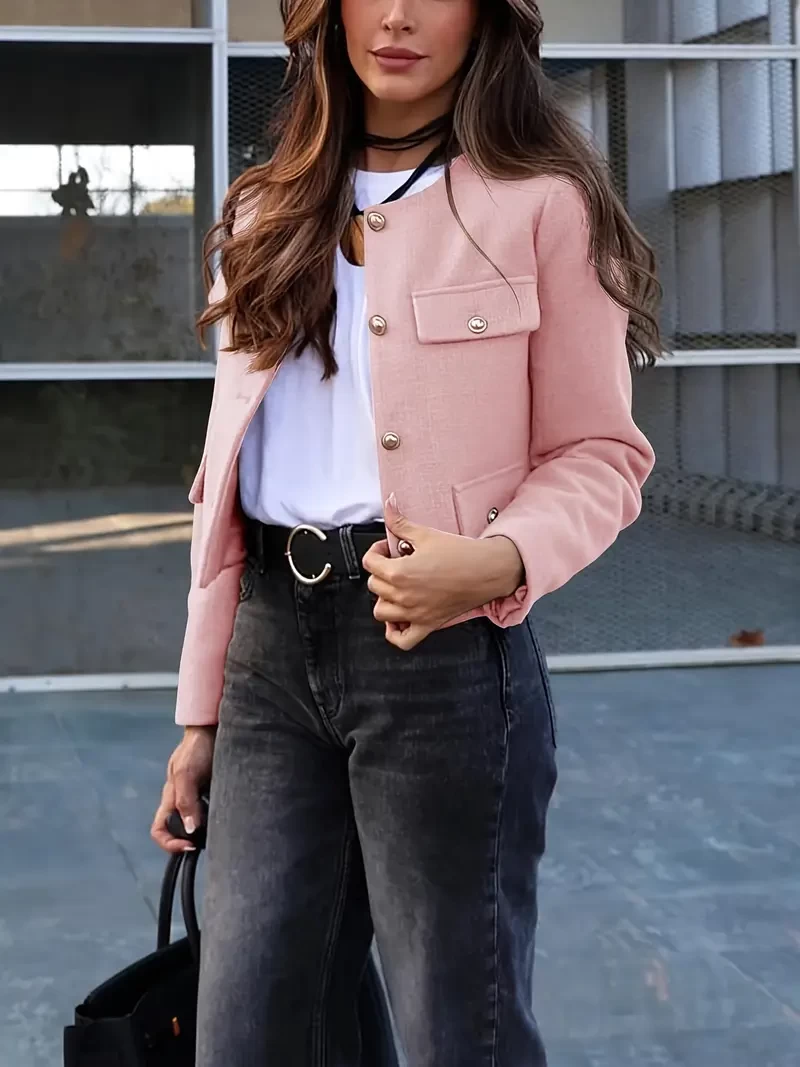 Women's Short cloth suit Jacket - Business Casual collarless tie - Polyester coat with pockets, short, Spring and Autumn elegant style, cute coat