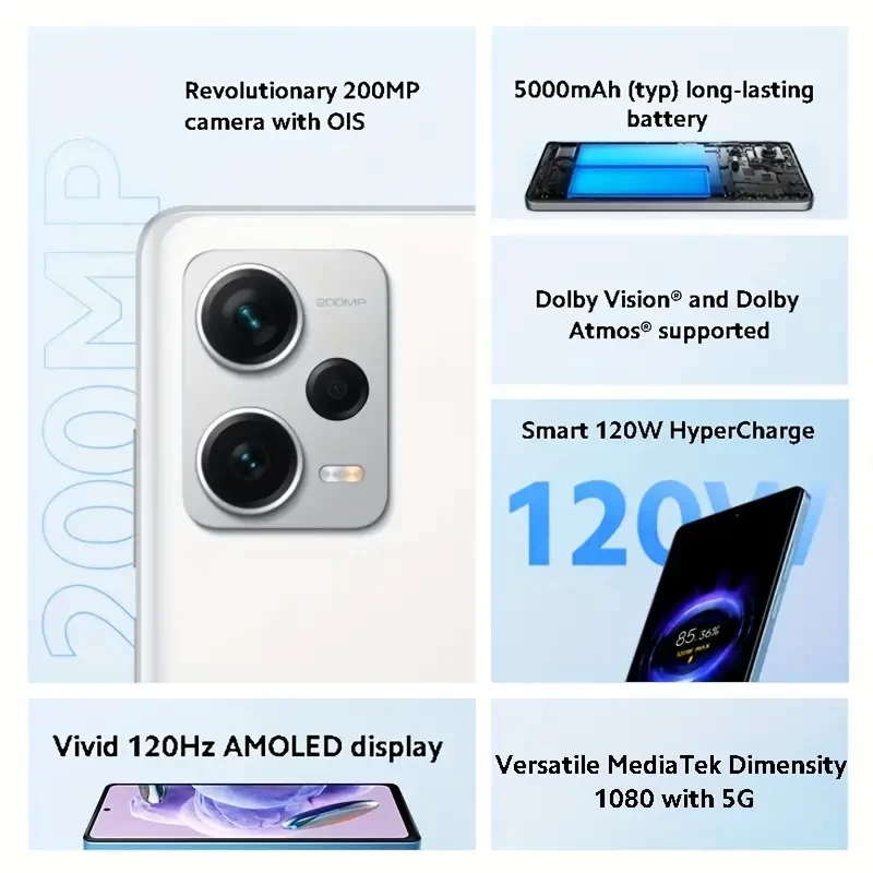 Xiaomi Redmi Note 12 Pro+ 5G NFC Smartphone 8GB RAM 256GB ROM MediaTek Dimensity 1080 6nm Manufacturing Process Up To 120Hz 6.67" FHD+ Flow AMOLED Display 200MP+8MP+2MP Triple Camera 16MP Camera 120W