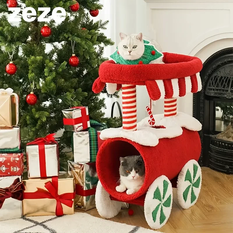 Zeze Christmas Train Cat Tree Christmas Decorations, Cat Nest Integrated Multifunctional Cat Climbing Frame Toy, Cat Scratching Post, Cat Bed